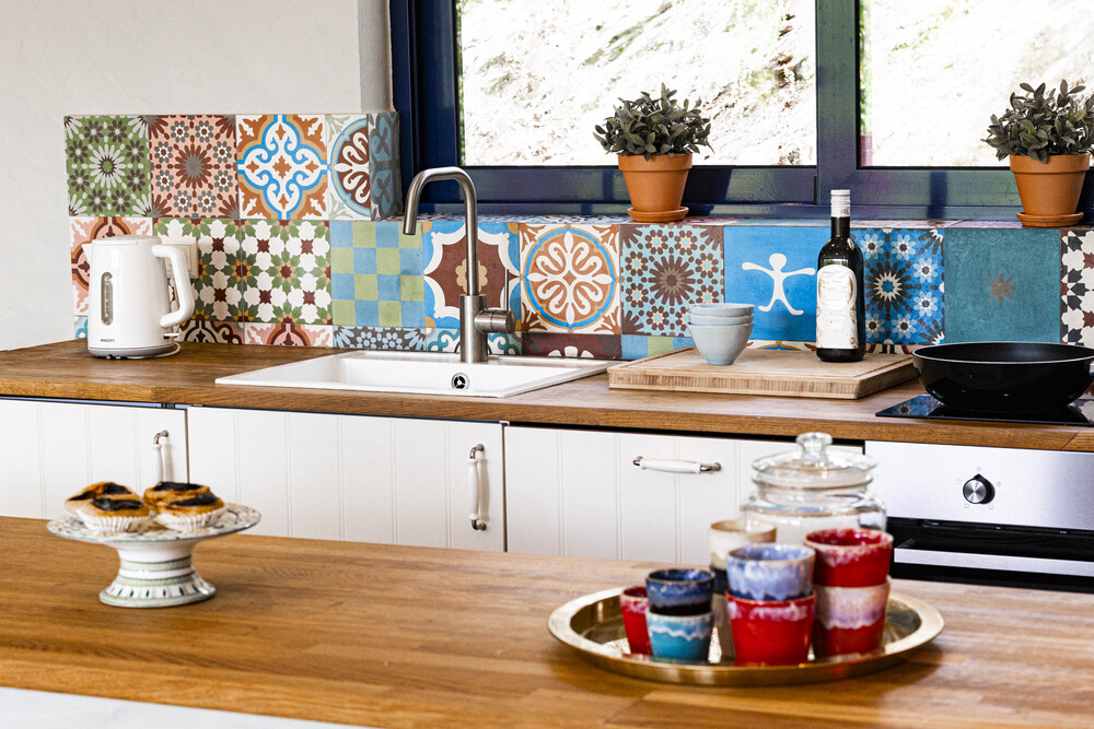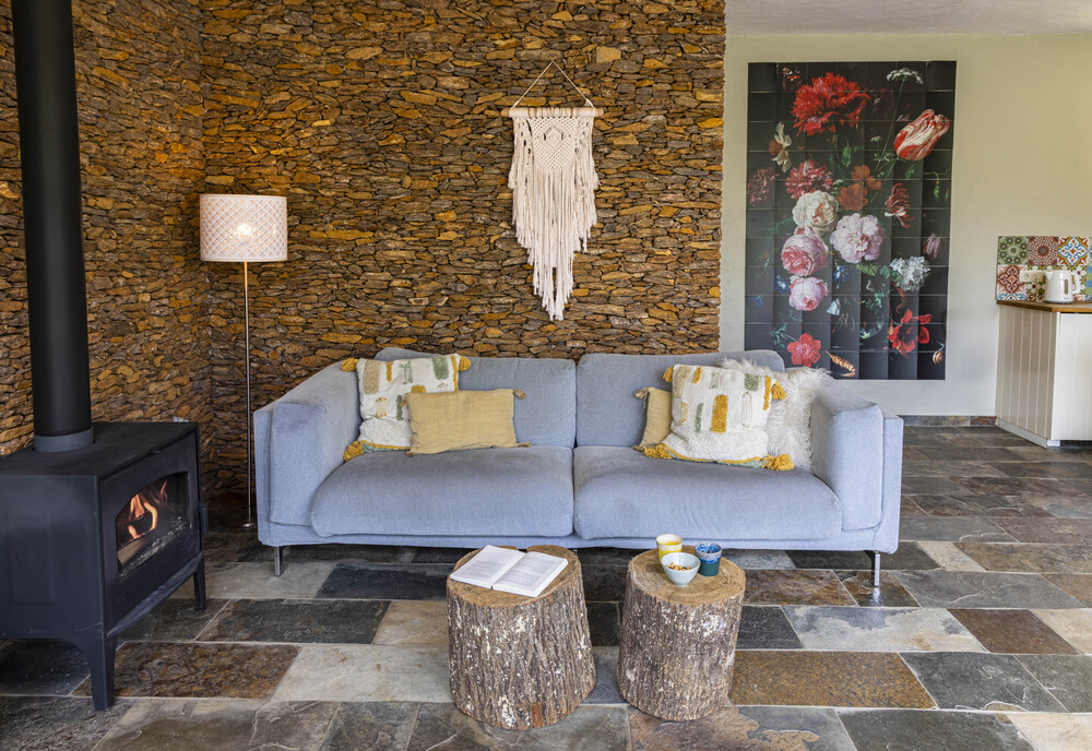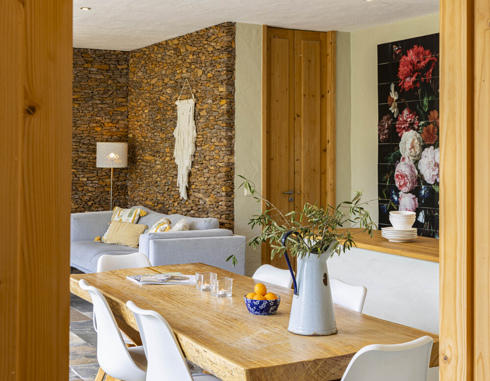 Die Wohnküche. Durch die Haustür betreten Sie das Wohnzimmer, die Wohnküche. Die Küche ist ausgestattet mit moderner Apparatur: Induktions-Kochplatte mit 4 Zonen, Kühlschrank mit Gefrierfach, Geschirrspüler, Nespresso Kaffeemaschine. Der Eßtisch bietet 6 Personen Platz. In der gemütlichen Sitzecke finden Sie einen holzgeheizten Ofen für kühlere Abende und eine herrliche Sitzbank.