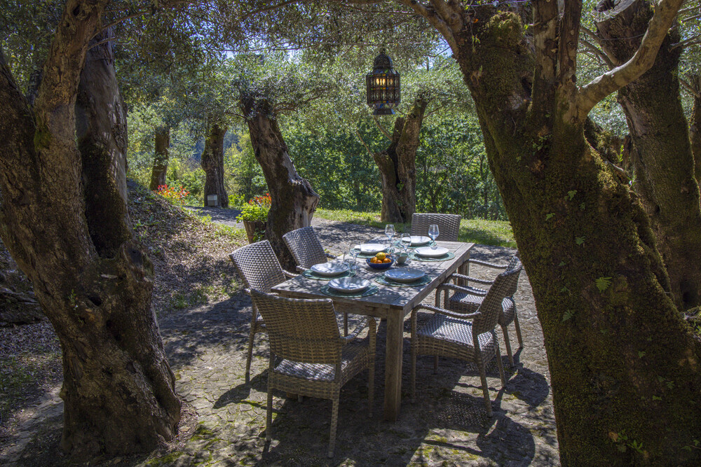 Die Terrasse. Durch eine große Schiebewand betreten Sie die Terrasse, auf der Sie in einem der teakhölzernen Lehnstühle eine atemberaubende Aussicht genießen können. Unter den Olivenbäumen finden Sie einen großen Tisch samt 6 Stühlen, an dem Sie Ihr Frühstück, Ihre Lunch und Ihr Abendessen genießen können. Eine Terrasse höher, erreichbar mit einer granitsteinernen Treppe, können Sie herrlich 'abkühlen' im eigenen Lounge-Pool.