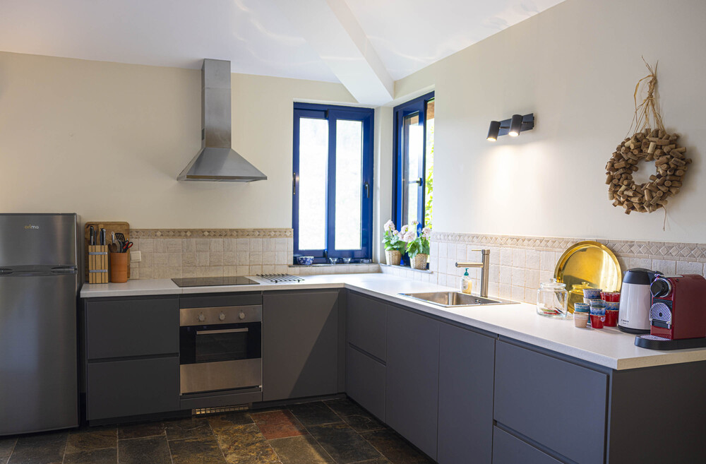 De open keuken is uitgerust met een 4 pits fornuis, koelkast, oven, Nespresso koffiemachine, en waterkoker. De eethoek biedt plaats voor 6 personen.